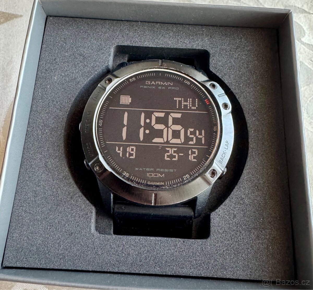 Displej je ve výborném stavu – od začátku nošeno ochranné sklo. Na lunetě drobné oděrky, pouze kosmetické. V listopadu jsem testoval reálnou výdrž v režimu chytrých hodinek s neustálým měřením tepu – hodinky vydržely 19 dní.