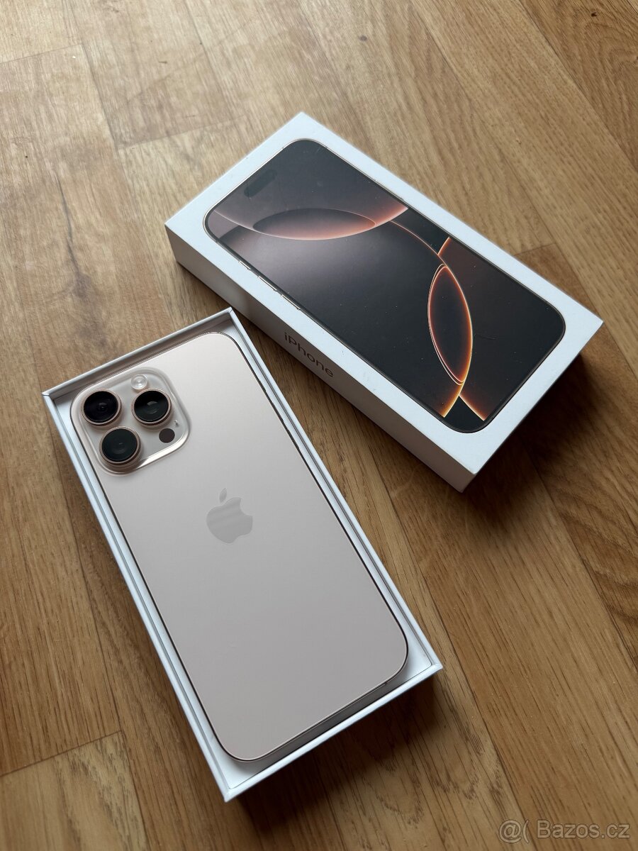 Prodám Apple iPhone 16 Pro Max 256GB v pouštní barvě titanu. Telefon ve stavu nového, vždy kryt a sklo, stav nového. Kondice baterie 93 %.