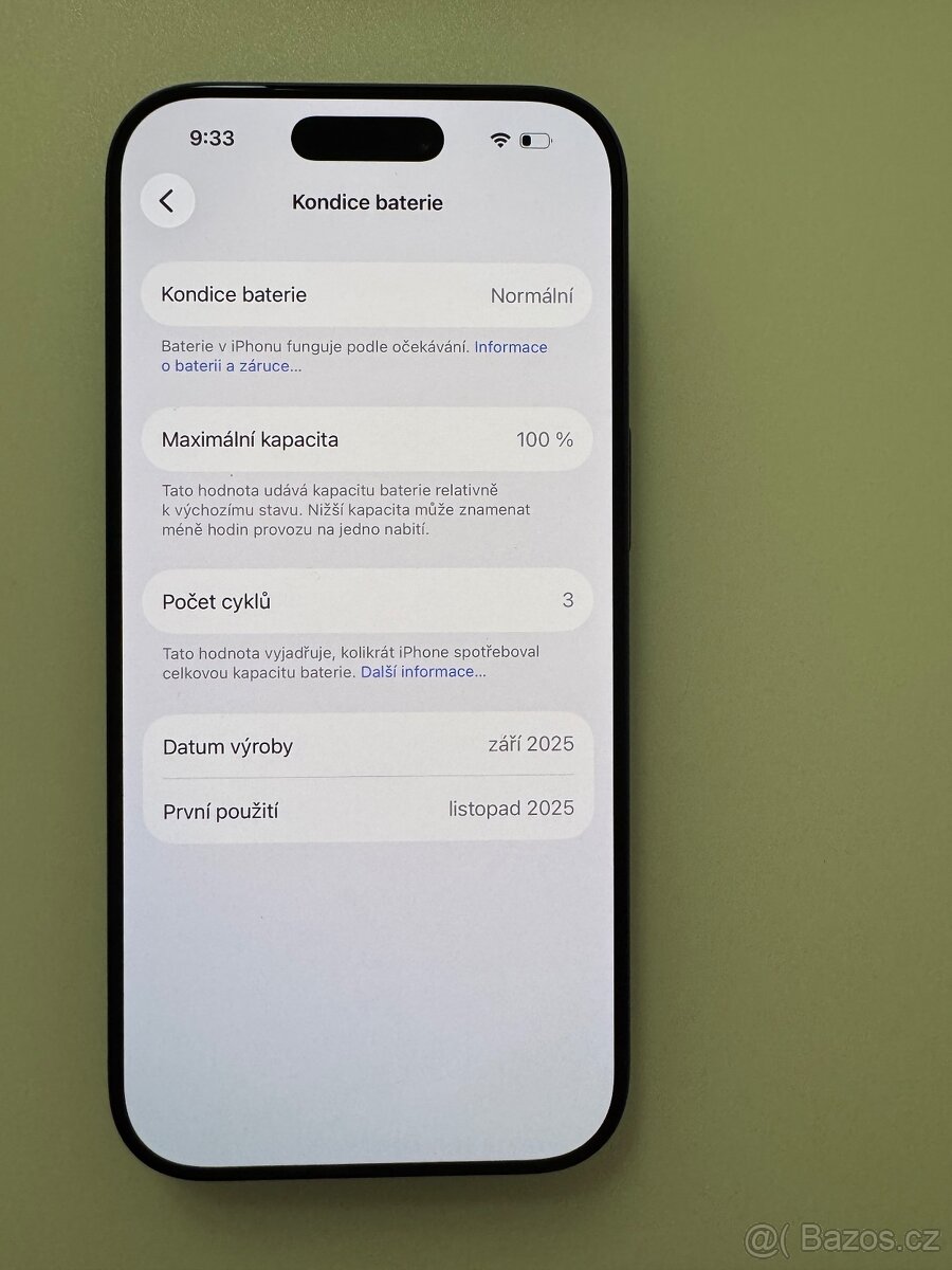 IPhone je zánovní, baterie má kondici 100%.