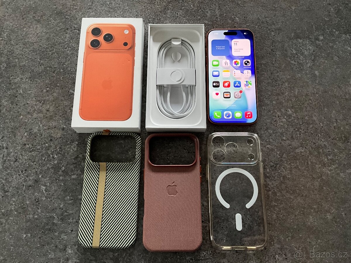 Prodam iPhone 17pro 256gb v oranžové barvě,super stav,vzdy použivan s krytem a s ochranným sklem na displeji.Kompletni original baleni,zaruka od iStyle do 30.9.2027,cz distribuce.Pridam par krytu,vse viz foto.Kapacita baterie 100%