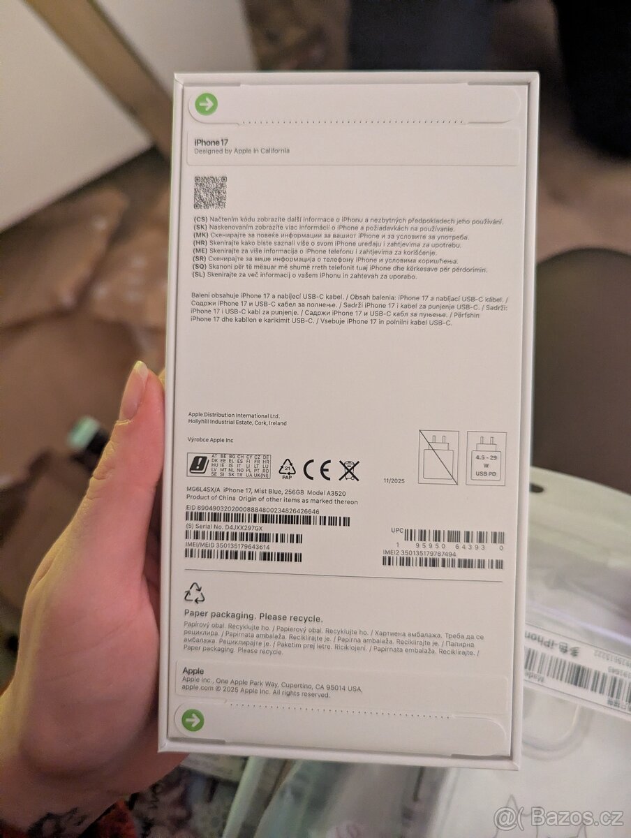 Prodám iPhone 17, 256 GB, barva Mist Blue, model A3520.