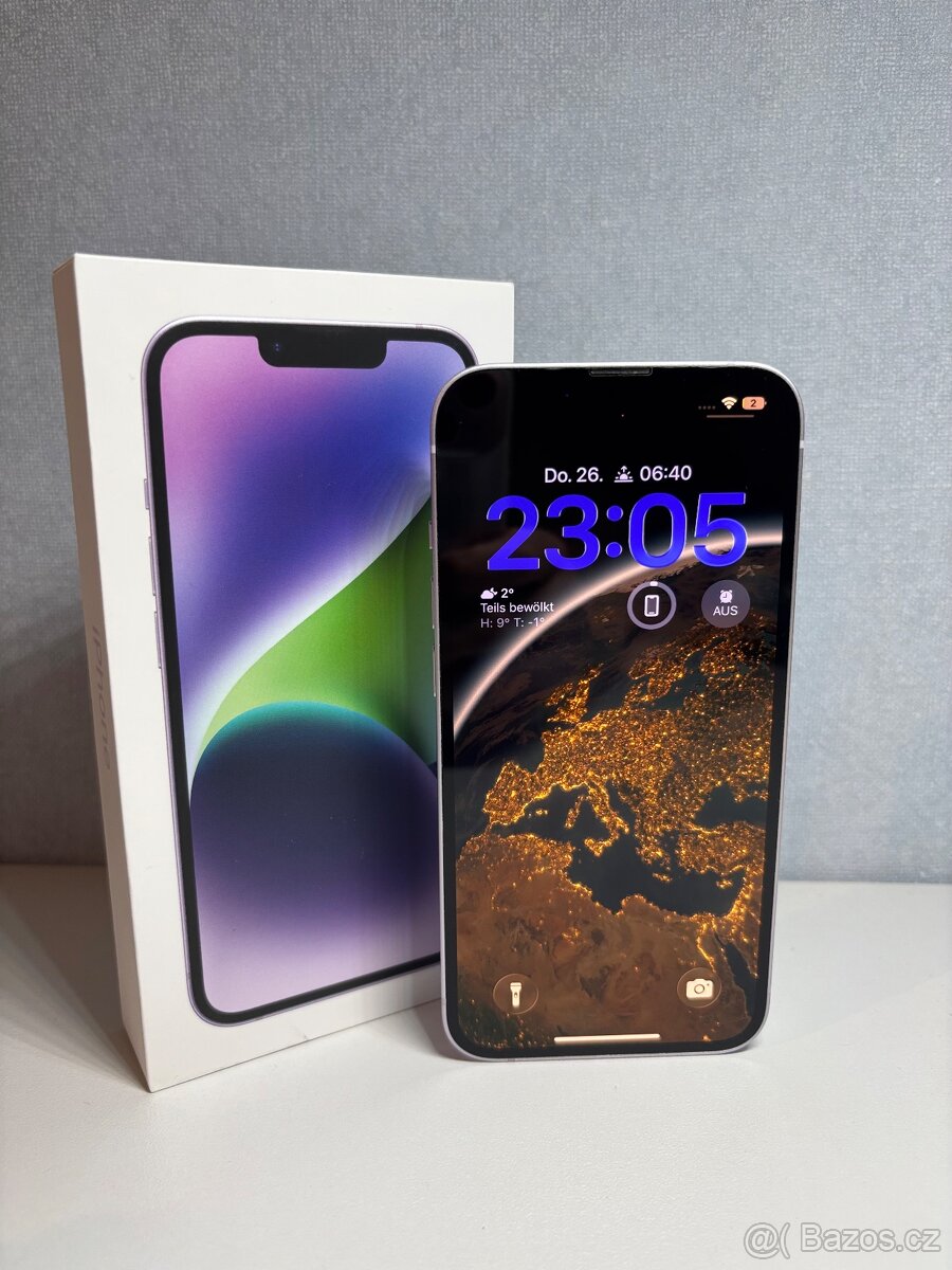 Prodám iPhone 14 s pamětí 128 GB v barvě fialová (Purple). Telefon je plně funkční, odhlášený z iCloudu a připravený pro nového majitele.