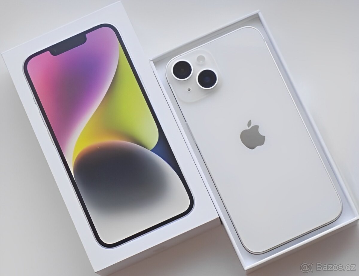 Nabízím tento nádherný ZÁNOVNÍ plně funkční iPhone 14 kapacity úložiště 128 GB krásné bílé barevné varianty v TOP STAVU, jako nový, s KONDICÍ BATERIE 100% a KOMPLETNÍM novým BALENÍM, prakticky koupíte nový kus se vším všudy.