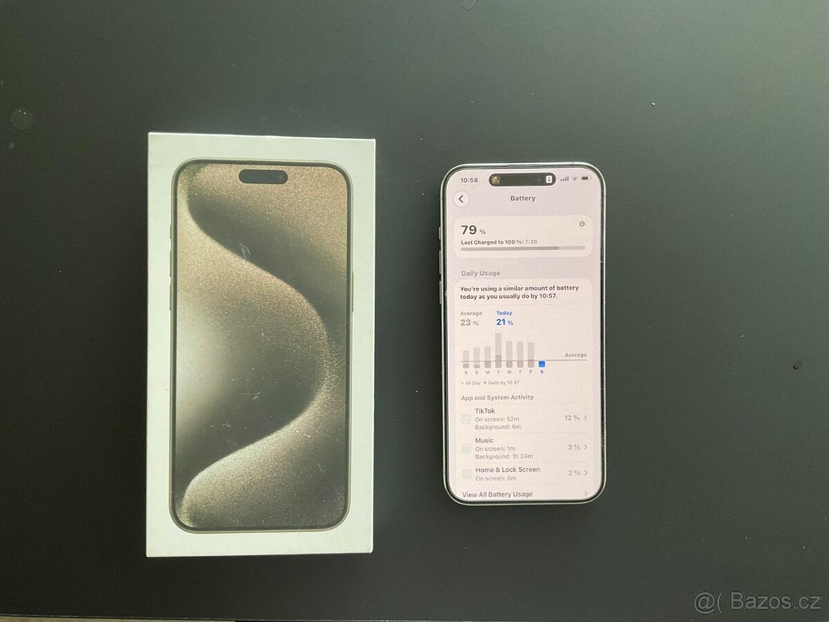 Prodám použitý Apple iphone 15 Pro Max 264GB Titan , kupovaný v Alze 15.6.2025 na a IČO,tak záruka ještě 3.mesice