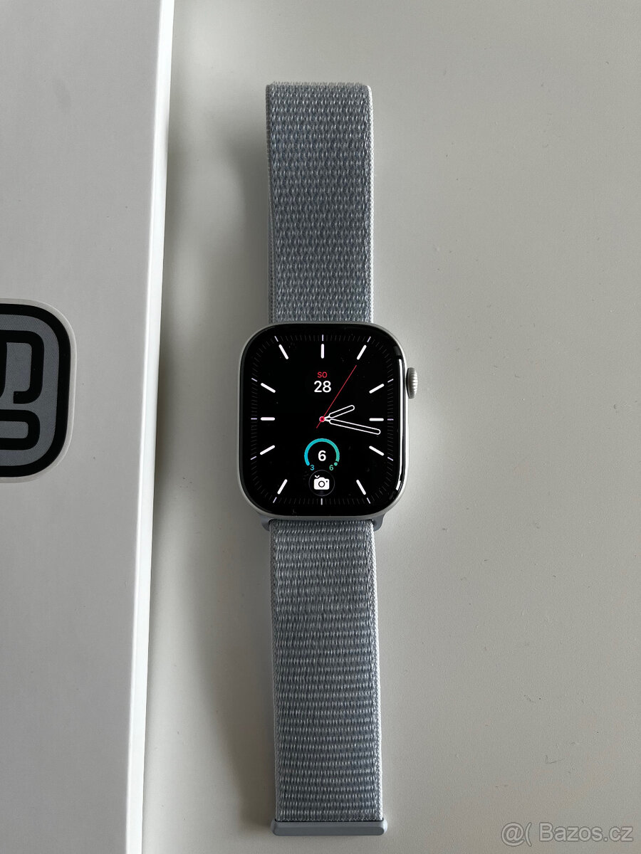 Prodám Apple Watch series 10, 46mm, stříbrný hliník s modrým textilním páskem.
