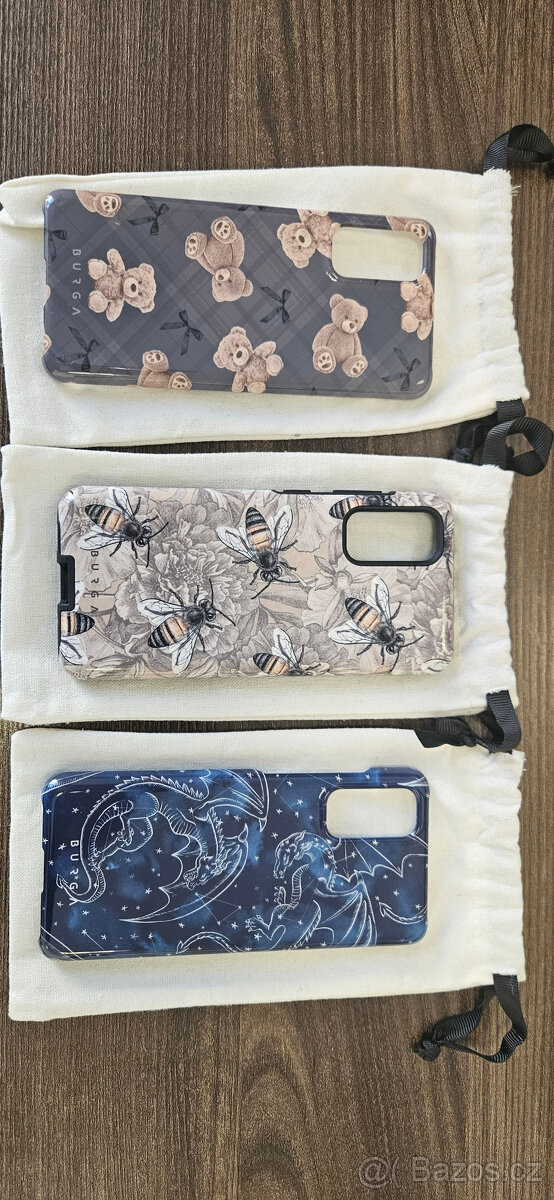 Prodám tři kryty značky BURGA na Samsung S20. Včelí kryt je nový, nepoužitý a je vystužený - cena 300,-Kč. Kryt s draky je také nový - cena 250,-Kč. Kryt s medvíky je chvilku používaný, drobné odřeniny - cena 200,-Kč.