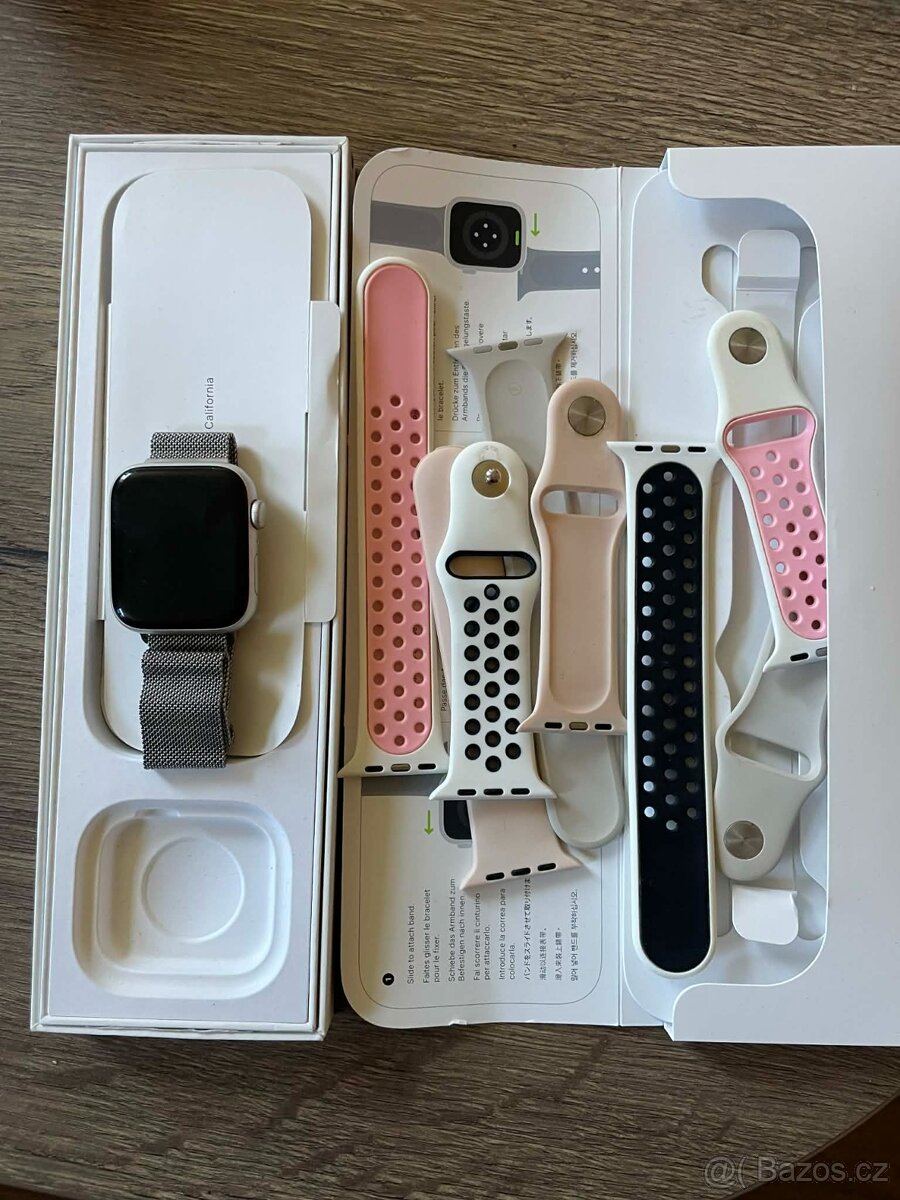 Prodám Apple Watch 44,SE 2.generace.Kondice baterie 86%.S krabičkou a náhradní pásky.